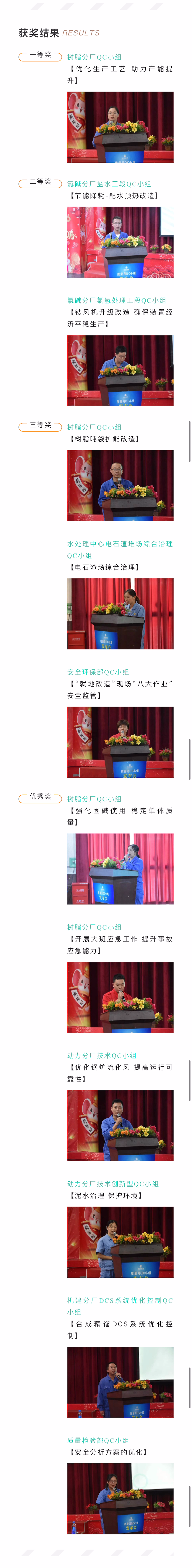 來自樹脂分廠、氯堿分廠、機(jī)建分廠、動力分廠、水處理中心、安全環(huán)保部、質(zhì)量檢驗部的12支QC小組的12名代表依次登場,從課題選定、要因調(diào)查、對策分析等多個方面,向在場人員介紹小組課題的攻關(guān)過程和取得的成果。發(fā)表人員也展示了高素質(zhì)水平,充分體現(xiàn)了自己對QC工作的執(zhí)著與熱愛。